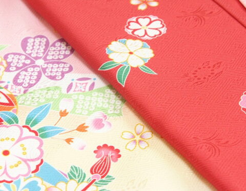 御着物は桜や梅、牡丹、芍薬などの色鮮やかな華々が描かれておりピンク色と赤色で大胆に染め分けられた配色と流れるような熨斗柄が御着物全体を華やかに彩ります。