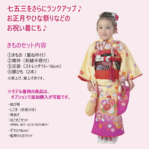 ※裁断方法により柄の出方が多少異なる場合がございます ◆内容(豪華7点セット) 着物(重ね衿付き)、襦袢(刺繍半襟付き)、足袋(ストレッチ15〜16cm)、腰ひも2本 ◆寸法 着丈 約74cm(腰上げ済) 裄丈 約40cm(肩上げ済) 袖丈 約60cm ◆素材 ポリエステル100% ◆お買い物ガイドについて ご注文前に、お買い物ガイドをご一読下さい。