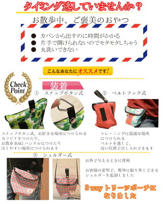商品説明 :丸洗いできる!! トリーツポーチ おやつポーチ 3way式 おやつのタイミング逃さない片手で開封できます 使い方3通り ◎スナップ式 ◎ベルト式 ◎ショルダー式 お好きな使い方でご利用ください ◎ マジックテープで開け閉めが簡単 ◎ 間口も大きいので、取り出しが楽ちん 金具を最小限にして、軽量化 中生地は、直接おやつを入れられるようにナイロン生地 汚れたら洗っていただけるので、常に清潔です *裁断の方向により、柄の出方が変わります ◎ マジックテープで開け閉めが簡単 ◎ 間口も大きいので、取り出しが楽ちん サイズ 画像をご覧ください ・素材:外:コットン 中:ナイロン ・色:画像をご覧ください ・注意事項:モニターの発色の具合によって実際のものと色が異なる場合があります1.2.3で与えられるトリーツポーチ