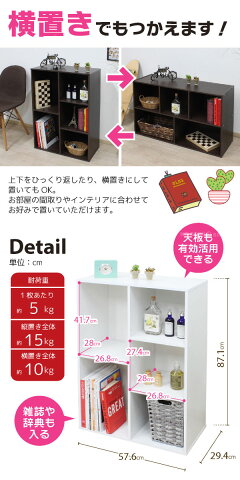 サイズ (約)幅57.6x奥行29.4x高さ87.1cm 耐荷重 1枚あたり(約)5kg 縦置き全体(約)15kg 横置き全体(約)10kg 材質 パーティクルボードプリント化粧紙 キーワード コンビボックス カラーボックス シェルフ 棚 オープン ラック 本棚 3段 2段 2列 木製 おしゃれ a4 コミック 収納ボックス dvd 横置き おもちゃ 子供 こども 収納 ラック 多目的ラック フリーラック フリーボックス 収納ボックス 本棚 書棚 リビングラック リビング収納 BV-SCBWHW BV-SCBDBR BV-SCBWN 201711-01