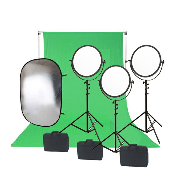 【セット内容】 LED丸型発光部 3個 ACコード5m 3本 ライトスタンド(75-240cm)エアクッション付 3本 専用収納バック3個 背景用サポートスタンド(高さ77-240cm 幅170-252cm)1セット 大型レフ板(102×168cm)1個 背景用布クロマキーグリーン(3×6m)1枚 撮影機材を超割価格で提供!初心者でも安心。