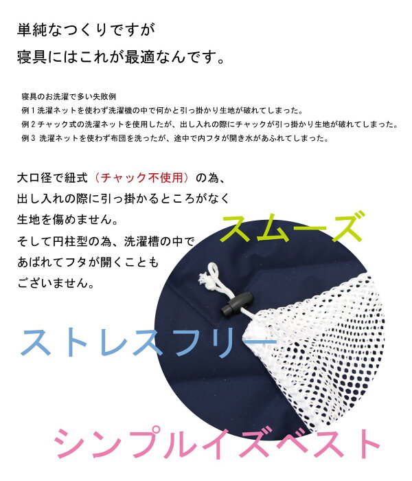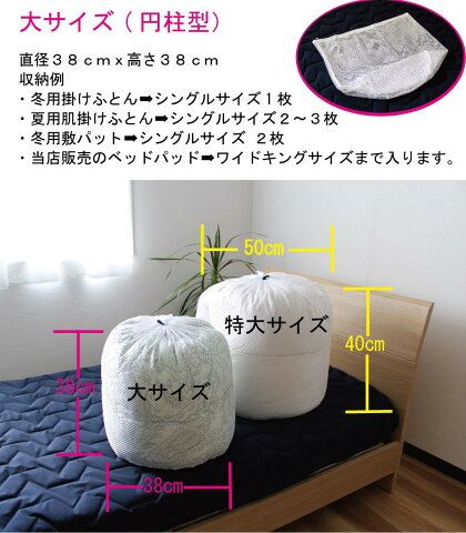 メーカー希望小売価格はメーカーカタログに基づいて掲載していますカタログ品番10-001-1洗濯ネット大サイズ(円柱型)大サイズ(円柱型)直径約38cmx高さ約38cm収納目安・夏用肌掛けふとん=シングルサイズ2~3枚・冬用掛けふとん=シングルサイズ1枚・敷パット=シングルサイズ2~3枚・当店販売のベッドパッド=ワイドキングサイズまでOK!!