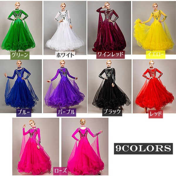 送料無料 社交ダンスドレス レディース ドレス ダンス衣装 ダンスドレス 刺繍 ボリューム アームドレス ダッチネク スタンダードドレス ワルツ モダン 練習着 競技ダンス ダンスウェア 大きいサイズ ブラック ホワイト ワインレッド イエロー パープル S M L XL 2XL 3XL