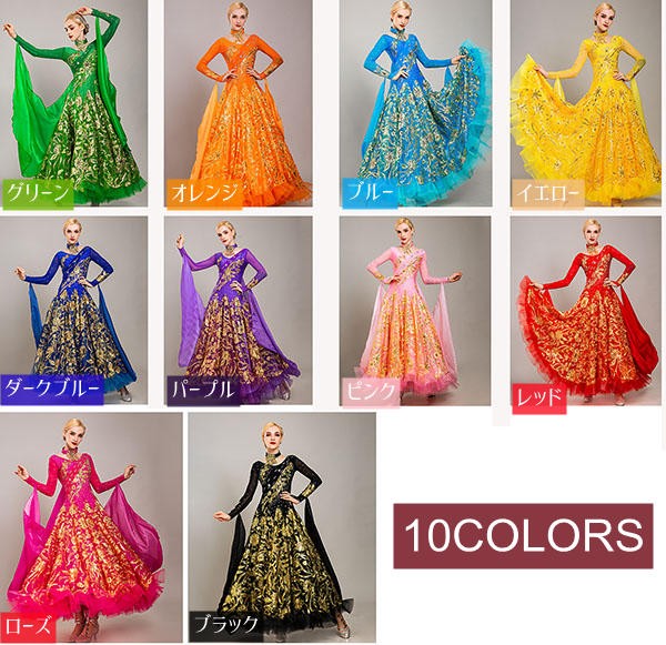送料無料 全10色 社交ダンスドレス レディース ドレス ダンス衣装 ダンスドレス 刺繍 ボリューム アームドレス ダッチネック スタンダードドレス ワルツ モダン 練習着 競技ダンス ダンスウェア ブラック レッド ローズ ピンク イエロー グリーン ブルーS M L XL 2XL 3XL